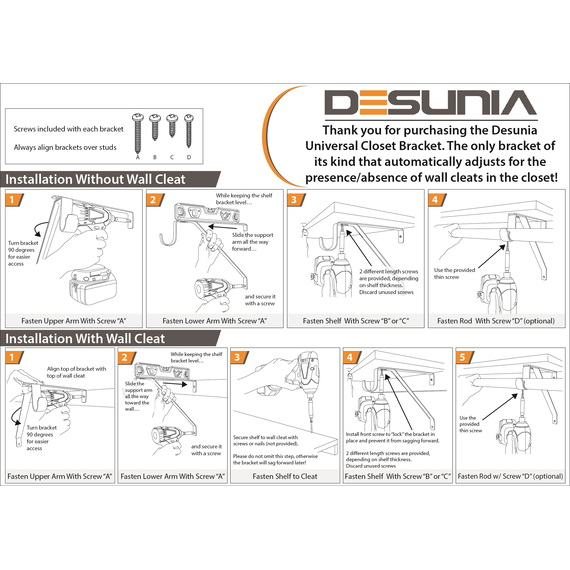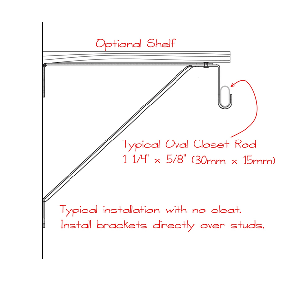 This closet shelf bracket from Desunia offer all sorts of versatility. For a really quick ""down and dirty"" installation, use them by themselves (without any wall cleats or end supports). Simply screw them right over the drywall (taking care to get a good bite into the studs), throw a shelf on top, cut the rod to length, and you can be hanging clothes inside of 30 minutes! Another approach would be to have a cleat on the back wall of the closet to give the shelf a little more support and to lend a more refined appearance to the job. These brackets can handle BOTH methods in a way we know you'll appreciate.