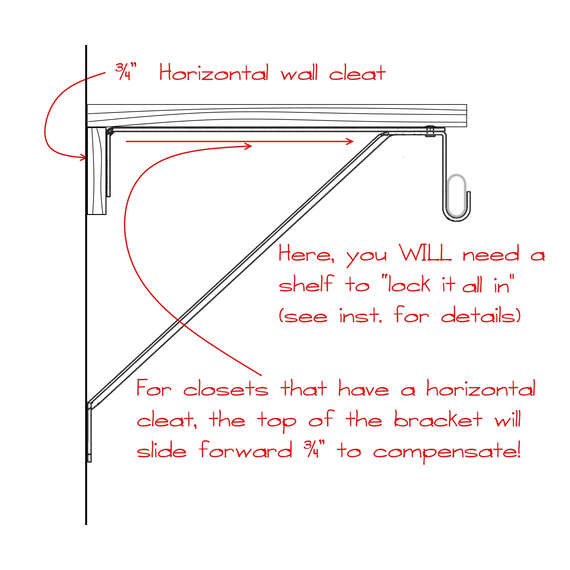 The horizontal and the angled members of each bracket are connected with a rivet through a slot, which allows the 2 components to slide back and forth up to 3/4"". Because of this design innovation, you can opt to use a 3/4"" thick wall cleat (or no cleat at all), and the bracket will compensate automatically! Oh, and BTW, there's another nice advantage to this design. During installation you can temporarily rotate the angled member of the bracket 90 degrees, giving you lots of elbow room to screw them in place. Sweet!